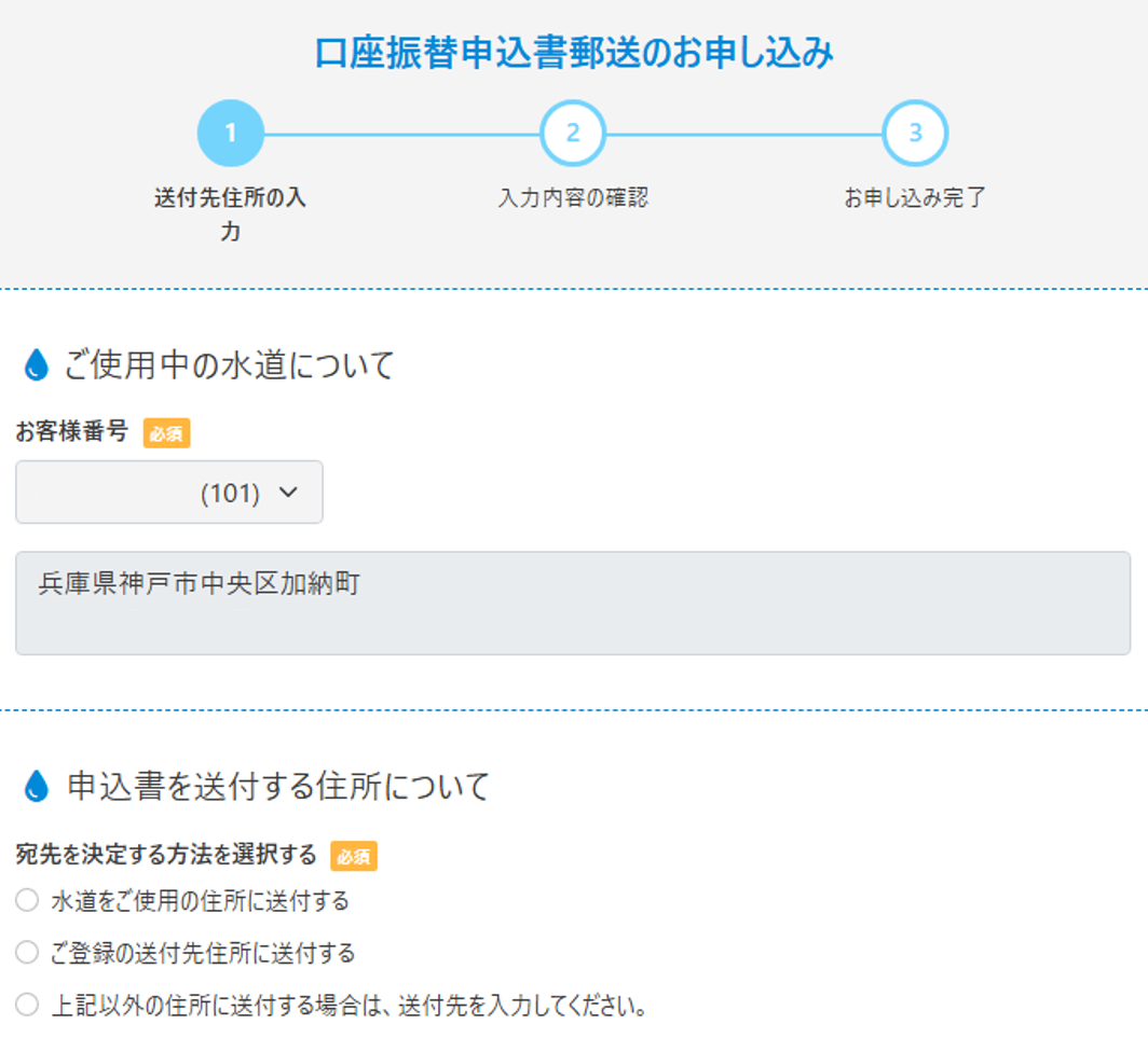 お客様番号(12桁)、口座振替を希望する金融機関名・支店番号・口座番号等のわかるものを事前にご用意ください。