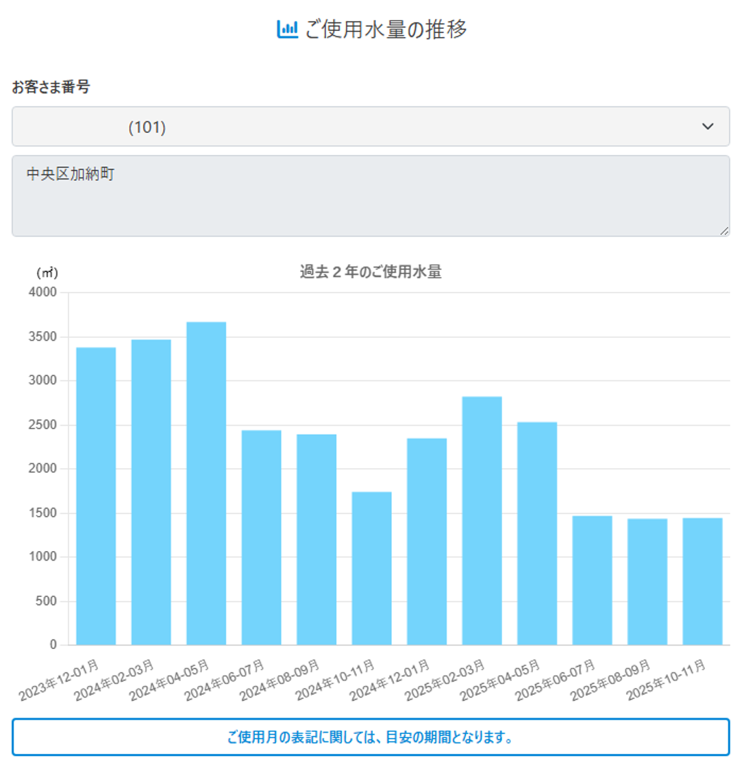 2. 画面上のメニュー「ご使用水量・料金のお知らせ」「ご使用水量の推移」のアイコンを選択