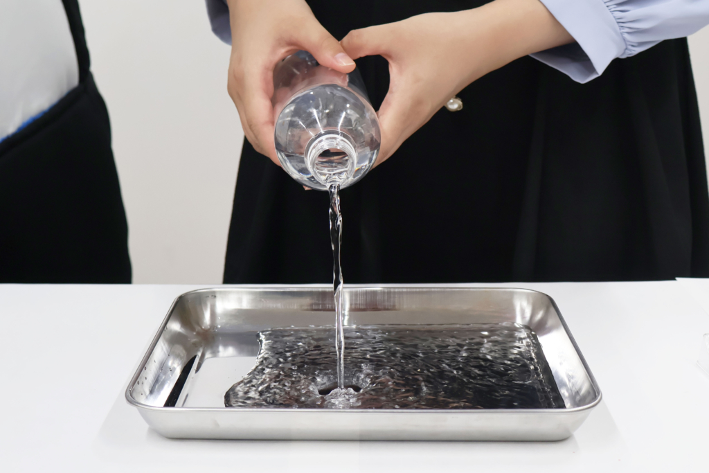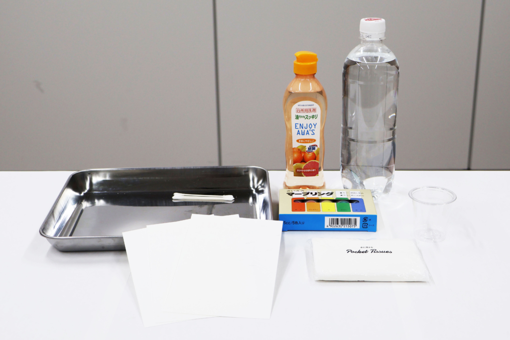 水に対して食器用せんざいを多く入れてしまうと、絵の具が一気に広がりきれいなマーブル模様ができにくくなります。食器用せんざいの量を少なくするか、水を多く入れて薄めたせんざい水を使用しましょう。