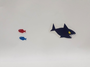これはバンドー神戸青少年科学館にある「光の屈折」にかかわる展示です。ここにある物質はみんな「屈折率」がちがうので、それぞれ光がちがう進み方をします。つまり、おくの絵の見え方がみんなちがうのです。おくの魚の絵は、すべてバラバラになっているように見えますが、それぞれの物質で光が屈折した結果、絵がつながって見えます。展示は第2展示室にあります。興味を持った人はぜひ屈折のふしぎを体験してください。